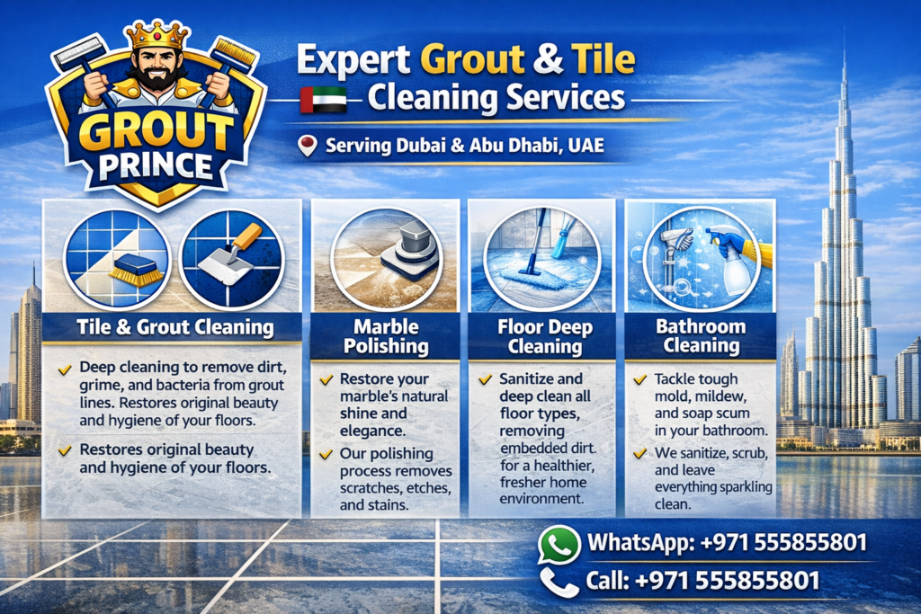 Grout Prince provides professional tile, grout, marble, and floor cleaning services in Dubai and Abu Dhabi. We help homes and businesses restore cleanliness, shine, and hygiene using advanced cleaning techniques and expert care.